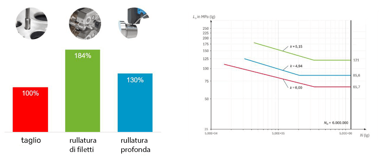 Se si confrontano le diverse varianti di filettatura utilizzando i diagrammi di Wöhler registrati, si vede chiaramente che la rullatura profonda del filetto aumenta la durata di vita di una vite rispetto ad un’altra prodotta per sola tornitura e non “trattata” in seguito. Il punto di flessione della retta di Wöhler, e quindi il passaggio alla resistenza a fatica, è dell’84% più alto per il filetto sottoposto a rullatura profonda rispetto al filetto solamente tornito. Espresso in sollecitazioni di carico, ciò significa un aumento da 65,7 MPa a 121,0 MPa.