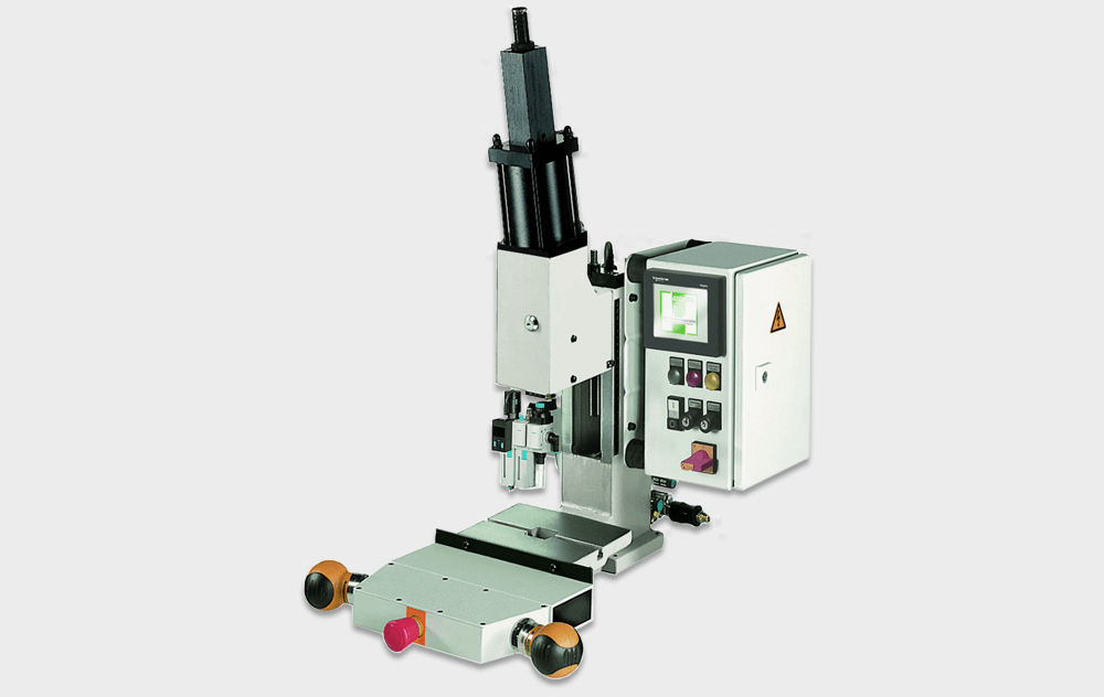 Pressette pneumatiche a ginocchiera con testa mobile Tipo KHKP. Tutte le pressette dispongono della rinomata guida prismatica Gechter, capace di garantire elevata precisione durante l'operazione di pressatura.