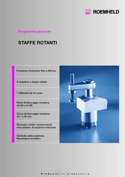 Le staffe rotanti (talvolta chiamate anche morse girevoli o cilindri rotanti) sono elementi di bloccaggio con pistone rotante. Esistono moltissimi modelli di cilindri rotanti, con un ampio campo di forze di bloccaggio, corse e possibilità di fissaggio. Le staffe rotanti idrauliche Roemheld sono note per la loro qualità estrema, che assicura una lunga vita di esercizio, una sicura manutenibilità e un solido investimento nel tempo. Le staffe rotanti idrauliche Roemheld hanno trovato applicazione in campi molto diversi, da attrezzatture di bloccaggio ad esecuzioni speciali. Spesso vengono anche definite “staffe girevoli” o “cilindri girevoli”, in virtù del particolare movimento di rotazione della staffetta di bloccaggio. Le staffe idrauliche Roemheld vengono costantemente aggiornate, per garantire un programma produttivo sempre al passo coi tempi, soprattutto nel campo del monitoraggio di stato.