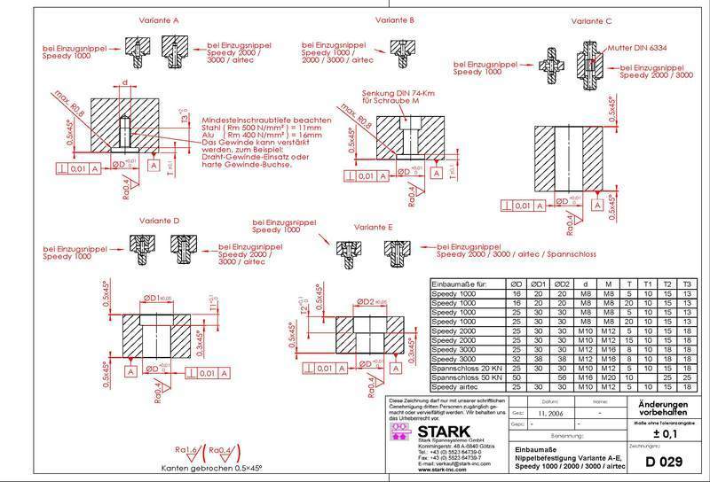 Per montare correttamente i sistemi a punto zero Stark è necessario eseguire con accuratezza le sedi. Una sede ben fatta è garanzia di precisione, quindi consentirà agli elementi di lavorare nelle migliori condizioni possibili, come da manuale. Scaricando le pagine di catalogo o visitando le sezioni riferite ad uno specifico prodotto è possibile associare quest’ultimo alla relativa sede di montaggio. E’ consigliabile verificare con assiduità la presenza di aggiornamenti per essere sicuri di disporre degli ultimi disegni costruttivi disponibili.